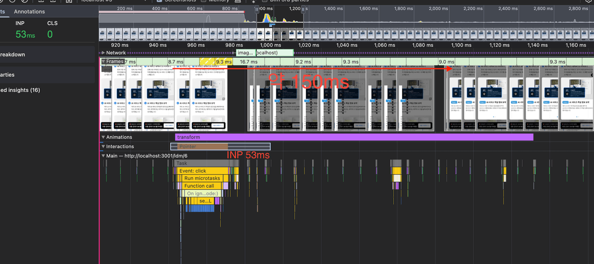 5번에서 슬라이더 내부의 구조가 복잡하여 메인 스레드에서 레이아웃 연산이 한번에 몰리고 작업 시간이 약 60ms를 넘어서는 것이다. (최상단 스크린샷 참고, 16ms를 넘으면 사람 눈에 포착된다.)
